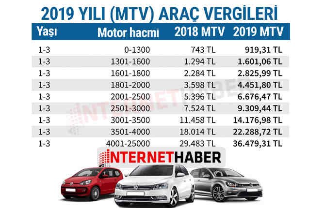 2019 yılında 1-3 yaş arası 0-1300 cc’lik bir otomobilin vergisi 743 TL’den 919 TL’ye çıktı. Pasaport ve ehliyet harçları ile trafik cezalarına da yüzde 23.73 oranında zam geldi. İşte bugün duyurulan MTV zammı sonrasında 2019 yılında ödeyeceğiniz otomobil vergileri: